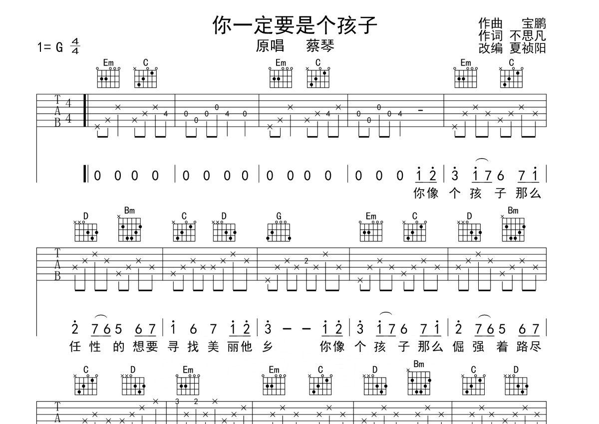 蔡琴《你一定要是个孩子》吉他谱 - G调弹唱六线谱