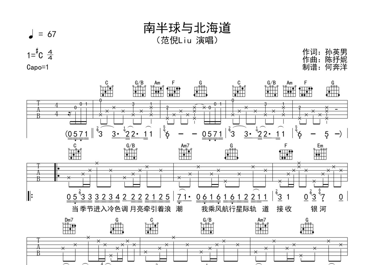 范倪liu《南半球与北海道》吉他谱 - C调弹唱六线谱