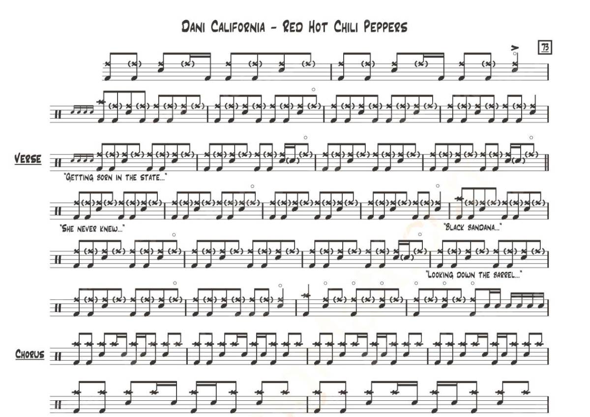 《Dani California》是Red Hot Chili Peppers演唱的一首歌曲,这份鼓谱共有一张高清图谱,图谱由 @打鼓谱 编配上传,图谱使用五线谱编配,使用这份Dani California架子鼓谱,你将能够轻松地敲打出这首Red Hot Chili Peppers的Dani California,快来尝试吧。《Dani California》是欧美摇滚乐队Red Hot Chili Peppers著名歌曲,本歌曲获得第49届格莱美年度最佳专辑(Album Of The Year)等提名。后被日本推理电影《死亡笔记(前篇)》作为片尾曲,并在《死亡笔记2:THE LAST NAME(最后的名字)》影片开始播放。红辣椒成立于1983年,是美国洛杉矶的摇滚乐队。 [1] 截至2011年其阵容包括Anthony Kiedis (主唱), Michael "Flea" Balzary (贝斯), Chad Smith 。