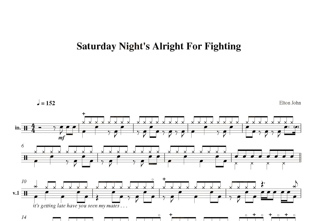 《Saturday nights alright for fighting》是Elton John演唱的一首歌曲,这份鼓谱共有四张高清图谱,图谱由 @打鼓谱 编配上传,图谱使用五线谱编配,使用这份Saturday nights alright for fighting架子鼓谱,你将能够轻松地敲打出这首Elton John的Saturday nights alright for fighting,快来尝试吧。首张收录专辑: 再見黃磚路