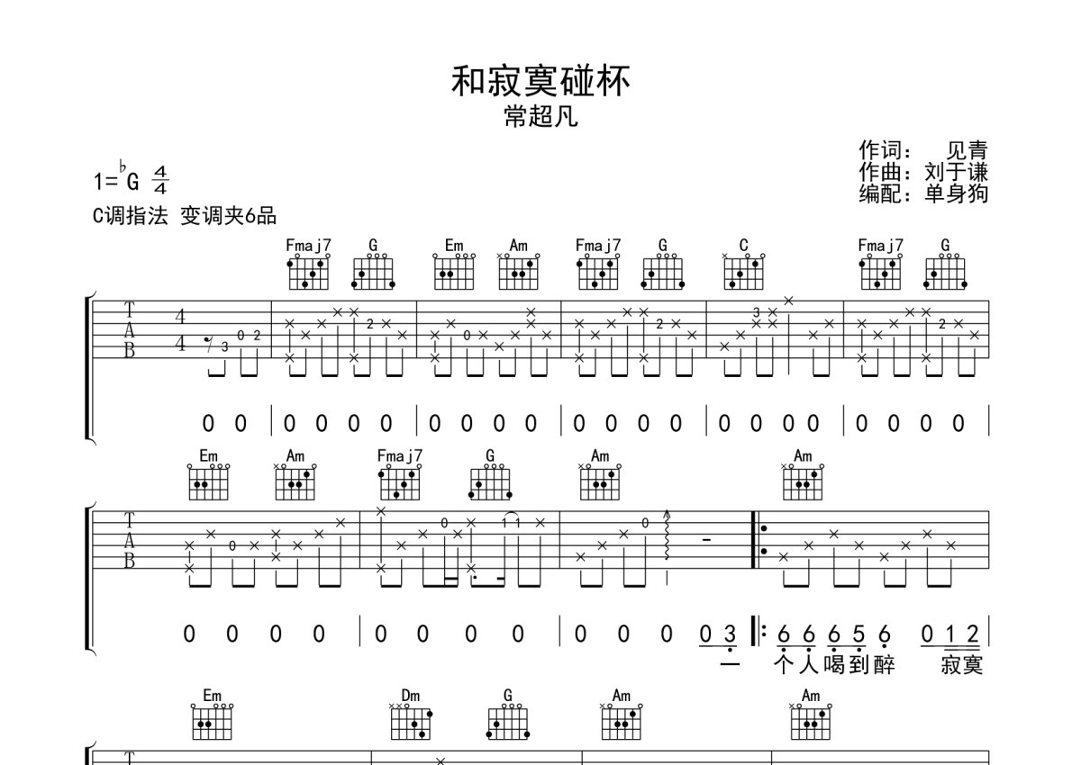 常超凡《和寂寞碰杯》吉他谱 - C调弹唱六线谱