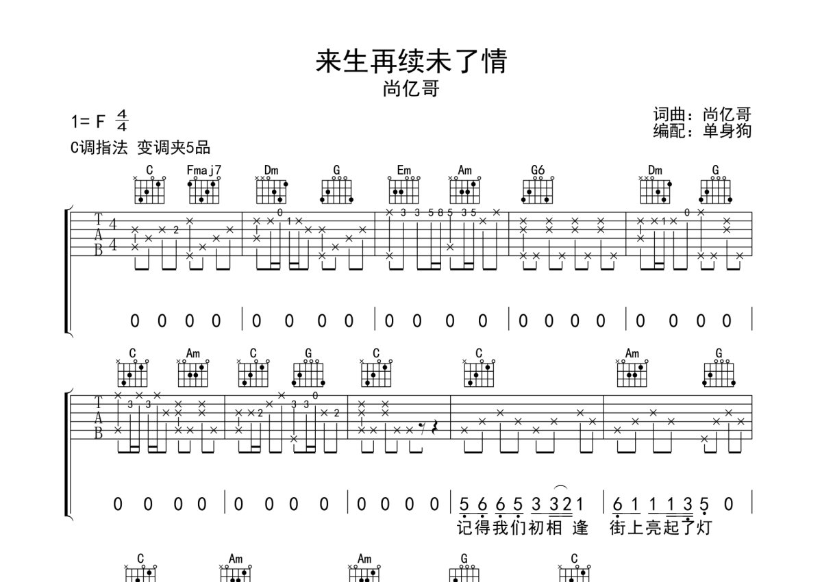 《来生再续未了情》是尚亿哥演唱的一首歌曲,歌曲原调为F调,但由于原调指法比较难,为了方便弹奏,本吉他谱采用的是C调指法编配,变调夹5品弹奏即为原调,当然也可以根据自己的音域改变变调夹位置,或者通过改变和弦调性,以方便自己弹奏,这份吉他谱共有四张高清图谱,图谱由 @单身狗 编配上传,图谱使用六线谱编配,包含吉他和弦指法、简谱以及歌词部分,使用这份来生再续未了情吉他谱,可以让你更加方便地掌握这首歌曲的弹唱技巧,快来尝试吧。