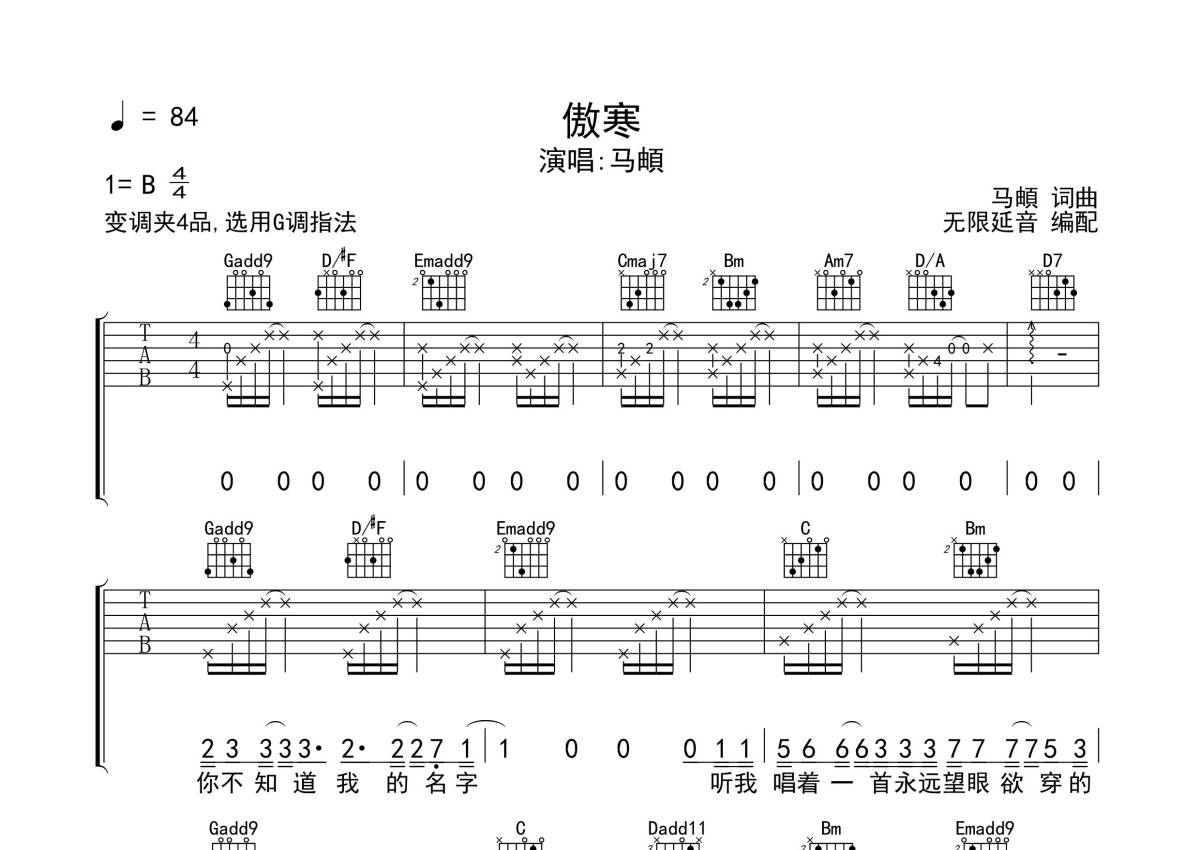 《傲寒》是马頔演唱的一首歌曲,歌曲原调为B调,但由于原调指法比较难,为了方便弹奏,本吉他谱采用的是G调指法编配,变调夹4品弹奏即为原调,当然也可以根据自己的音域改变变调夹位置,或者通过改变和弦调性,以方便自己弹奏,这份吉他谱共有四张高清图谱,图谱由 @无限延音 编配上传,图谱使用六线谱编配,包含吉他和弦指法、简谱以及歌词部分,使用这份傲寒吉他谱,可以让你更加方便地掌握这首歌曲的弹唱技巧,快来尝试吧。
