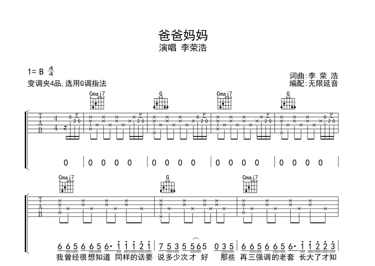 李荣浩《爸爸妈妈》吉他谱 - G调弹唱六线谱