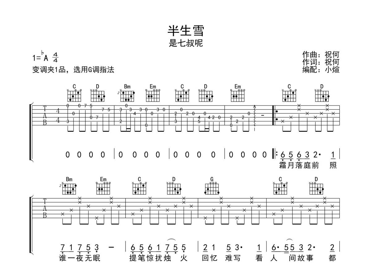 《半生雪》是是七叔呢演唱的一首歌曲,歌曲原调为Ab调,但由于原调指法比较难,为了方便弹奏,本吉他谱采用的是G调指法编配,变调夹1品弹奏即为原调,当然也可以根据自己的音域改变变调夹位置,或者通过改变和弦调性,以方便自己弹奏,这份吉他谱共有三张高清图谱,图谱由 @无限延音 编配上传,图谱使用六线谱编配,包含吉他和弦指法、简谱以及歌词部分,使用这份半生雪吉他谱,可以让你更加方便地掌握这首歌曲的弹唱技巧,快来尝试吧。