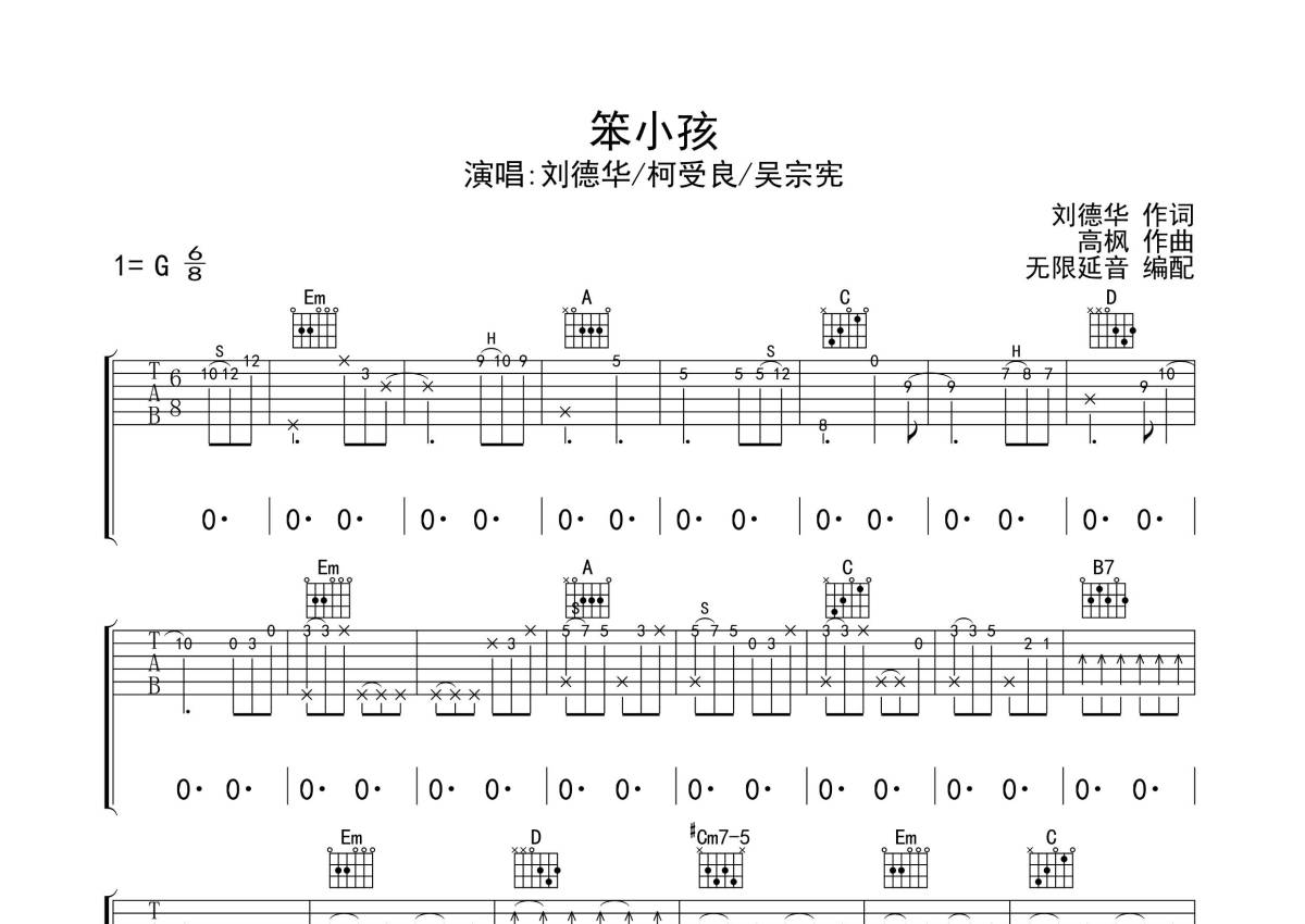 刘德华/柯受良/吴宗宪《笨小孩》吉他谱 - G调弹唱六线谱