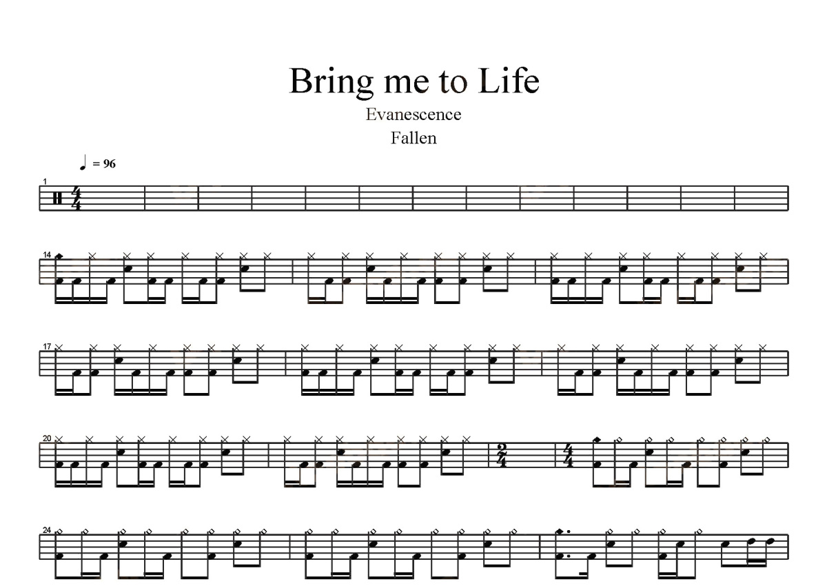 《Bring Me To Life》是Evanescence演唱的一首歌曲,这份鼓谱共有三张高清图谱,图谱由 @打鼓谱 编配上传,图谱使用五线谱编配,使用这份Bring Me To Life架子鼓谱,你将能够轻松地敲打出这首Evanescence的Bring Me To Life,快来尝试吧。《Bring Me to Life》(《带我重生》)是幻灭乐队(Evanescence)最成功并且最富盛名的单曲。