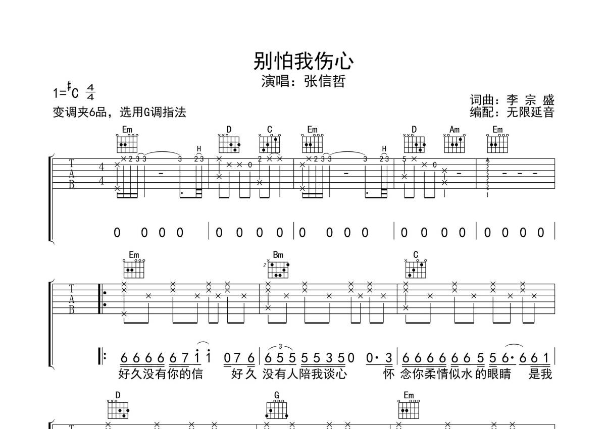张信哲《别怕我伤心》吉他谱 - G调弹唱六线谱