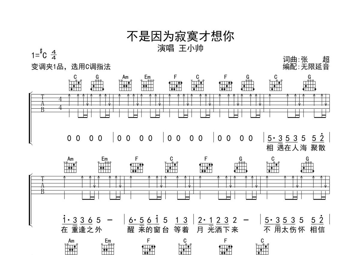 王小帅《不是因为寂寞才想你》吉他谱 - C调弹唱六线谱
