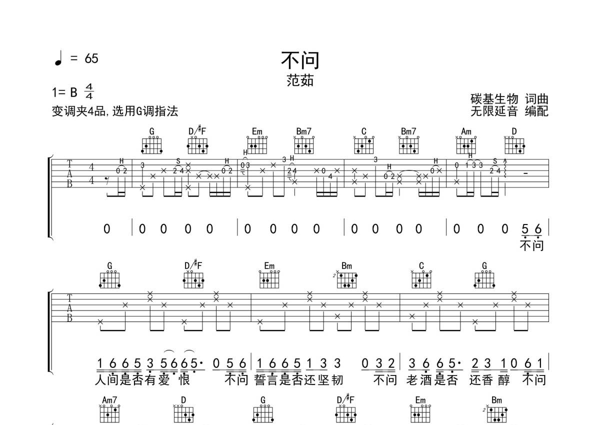 《不问》是范茹演唱的一首歌曲,歌曲原调为B调,但由于原调指法比较难,为了方便弹奏,本吉他谱采用的是G调指法编配,变调夹4品弹奏即为原调,当然也可以根据自己的音域改变变调夹位置,或者通过改变和弦调性,以方便自己弹奏,这份吉他谱共有两张高清图谱,图谱由 @无限延音 编配上传,图谱使用六线谱编配,包含吉他和弦指法、简谱以及歌词部分,使用这份不问吉他谱,可以让你更加方便地掌握这首歌曲的弹唱技巧,快来尝试吧。