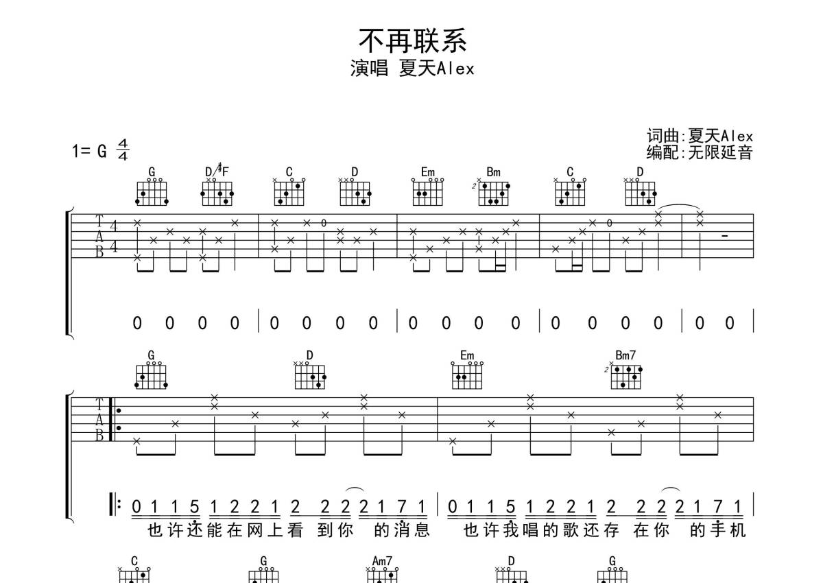 夏天Alex《不再联系》吉他谱 - G调弹唱六线谱