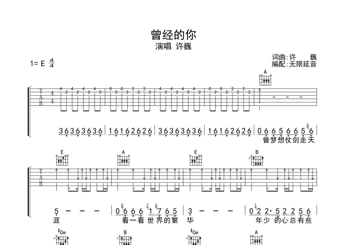 许巍《曾经的你》吉他谱 - E调弹唱六线谱
