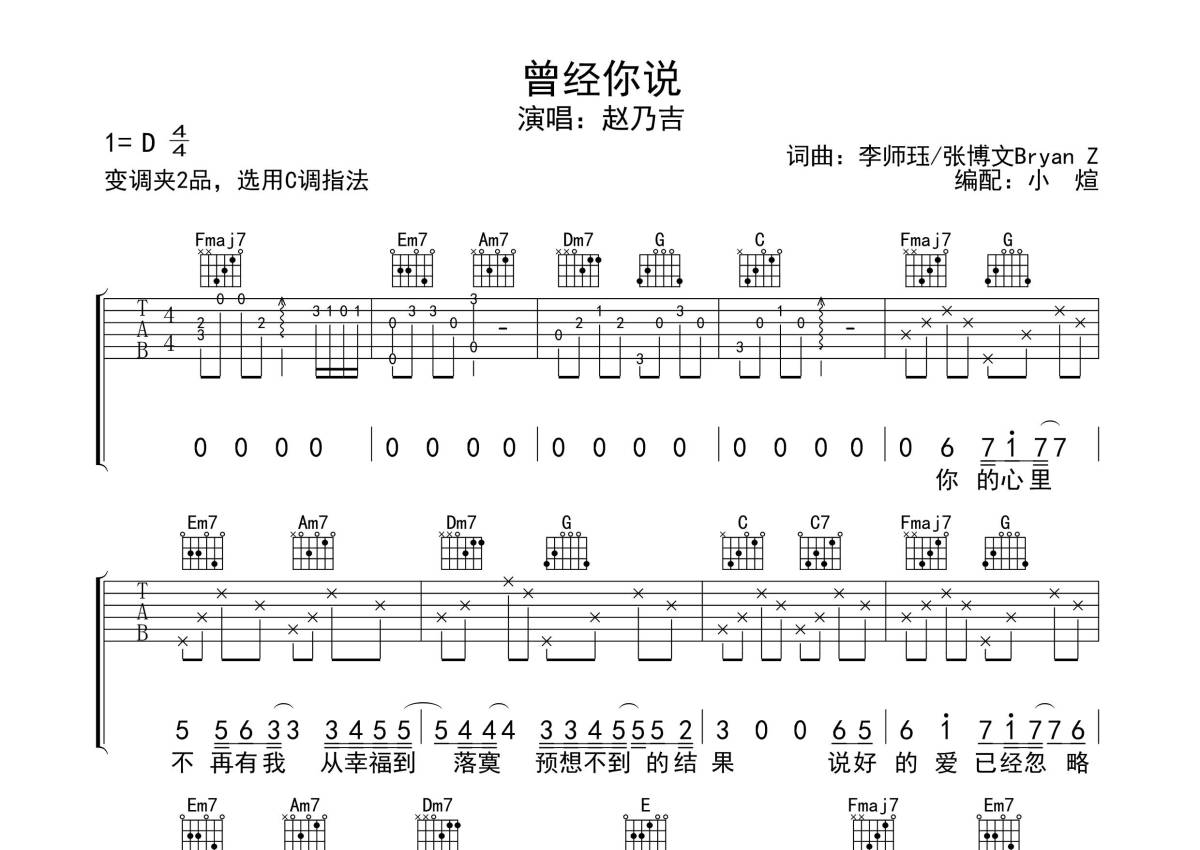 《曾经你说》是赵乃吉演唱的一首歌曲,歌曲原调为D调,但由于原调指法比较难,为了方便弹奏,本吉他谱采用的是C调指法编配,变调夹2品弹奏即为原调,当然也可以根据自己的音域改变变调夹位置,或者通过改变和弦调性,以方便自己弹奏,这份吉他谱共有三张高清图谱,图谱由 @无限延音 编配上传,图谱使用六线谱编配,包含吉他和弦指法、简谱以及歌词部分,使用这份曾经你说吉他谱,可以让你更加方便地掌握这首歌曲的弹唱技巧,快来尝试吧。