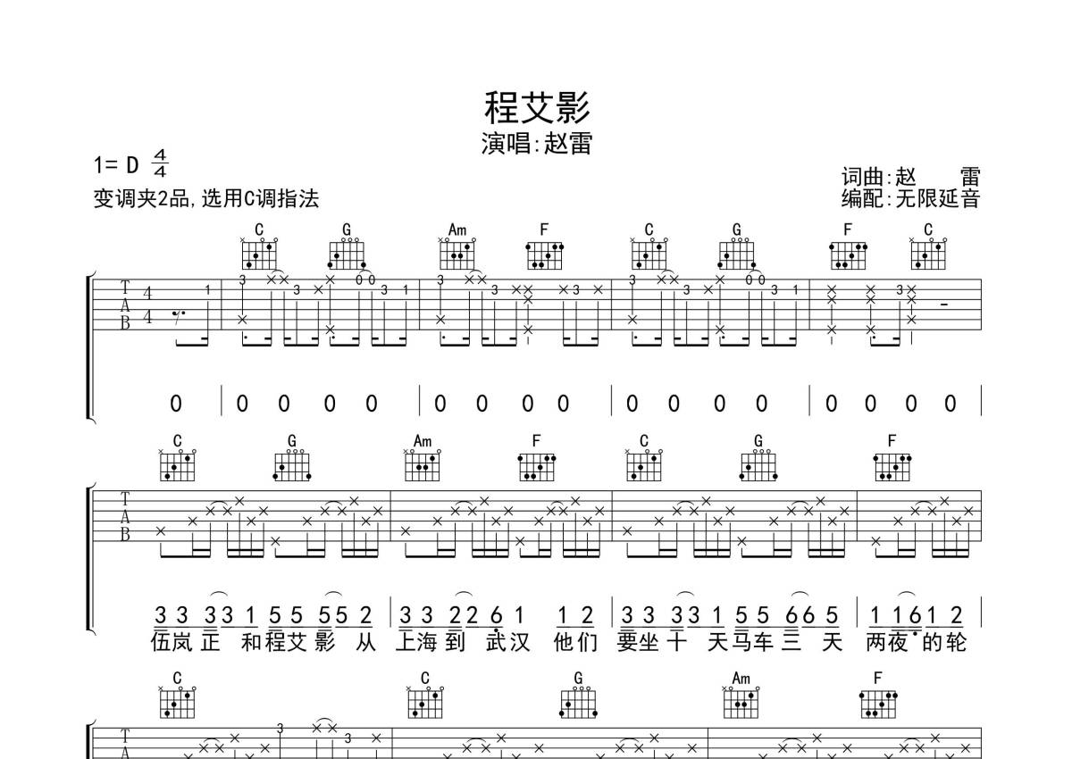 《程艾影》是赵雷演唱的一首歌曲,歌曲原调为D调,但由于原调指法比较难,为了方便弹奏,本吉他谱采用的是C调指法编配,变调夹2品弹奏即为原调,当然也可以根据自己的音域改变变调夹位置,或者通过改变和弦调性,以方便自己弹奏,这份吉他谱共有三张高清图谱,图谱由 @无限延音 编配上传,图谱使用六线谱编配,包含吉他和弦指法、简谱以及歌词部分,使用这份程艾影吉他谱,可以让你更加方便地掌握这首歌曲的弹唱技巧,快来尝试吧。