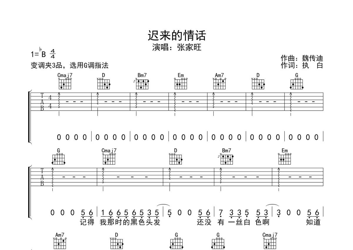 张家旺《迟来的情话》吉他谱 - G调弹唱六线谱