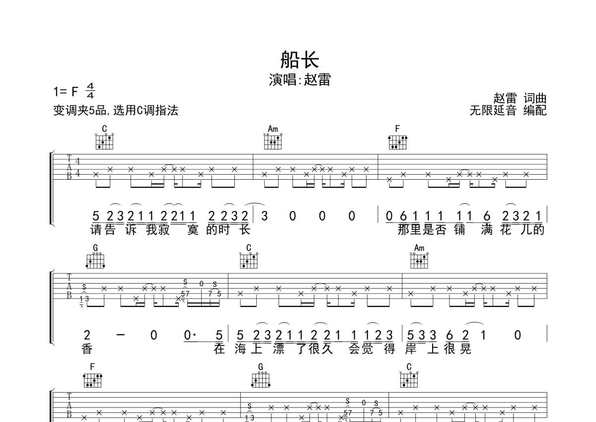 赵雷《船长》吉他谱 - C调弹唱六线谱