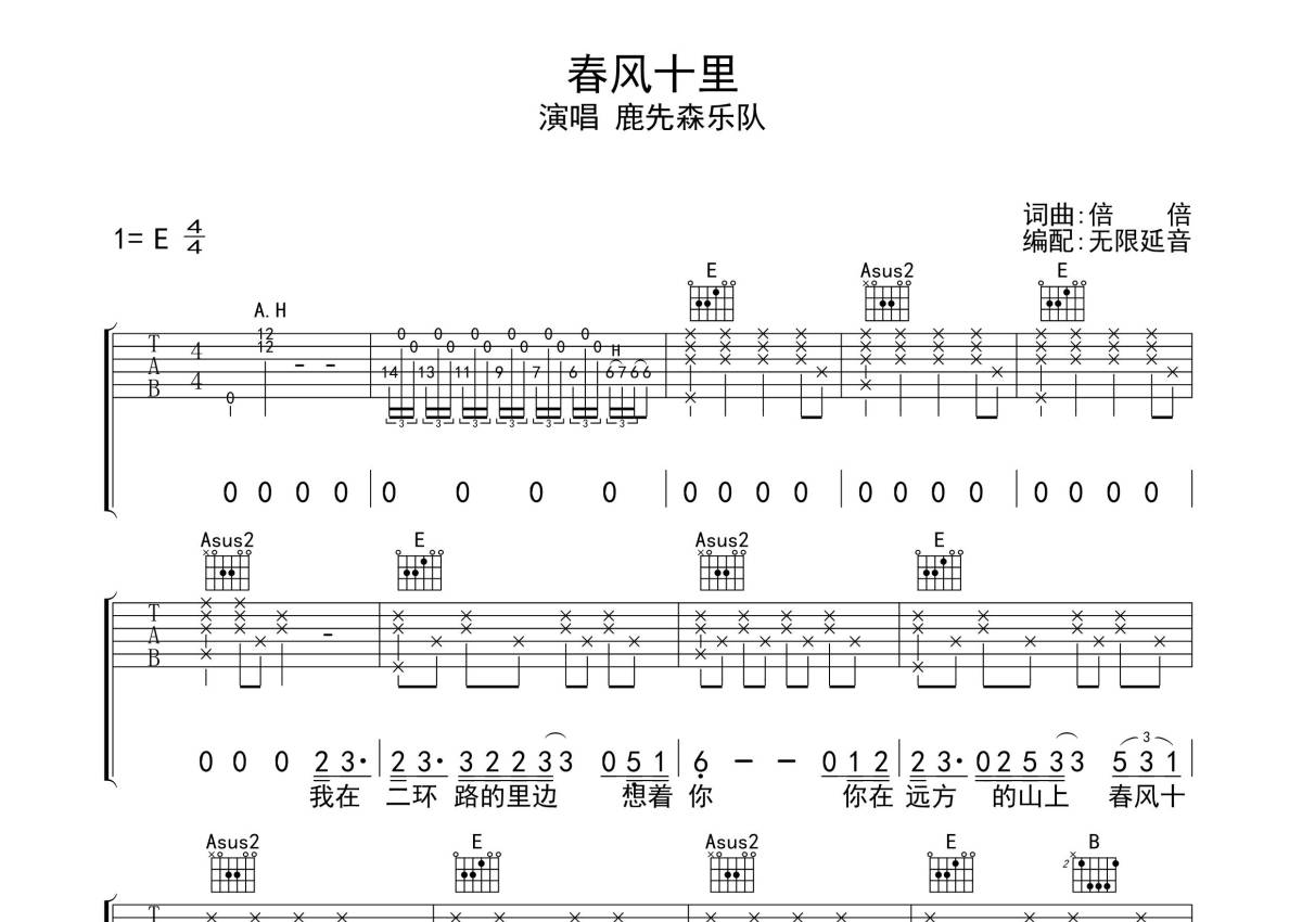 鹿先森乐队《春风十里》吉他谱 - E调弹唱六线谱