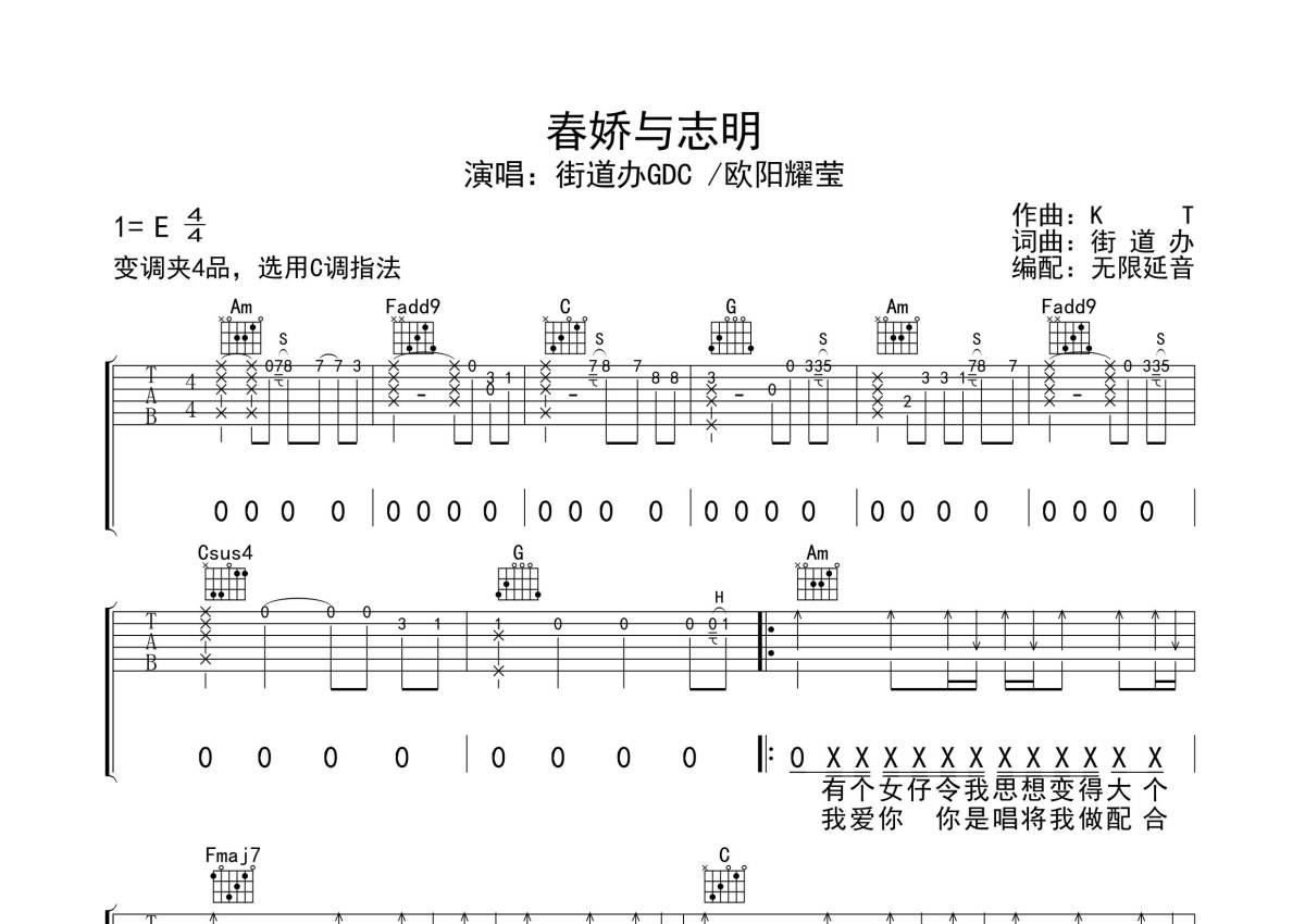 《春娇与志明》是街道办GDC/欧阳耀莹演唱的一首歌曲,歌曲原调为E调,但由于原调指法比较难,为了方便弹奏,本吉他谱采用的是C调指法编配,变调夹4品弹奏即为原调,当然也可以根据自己的音域改变变调夹位置,或者通过改变和弦调性,以方便自己弹奏,这份吉他谱共有三张高清图谱,图谱由 @无限延音 编配上传,图谱使用六线谱编配,包含吉他和弦指法、简谱以及歌词部分,使用这份春娇与志明吉他谱,可以让你更加方便地掌握这首歌曲的弹唱技巧,快来尝试吧。