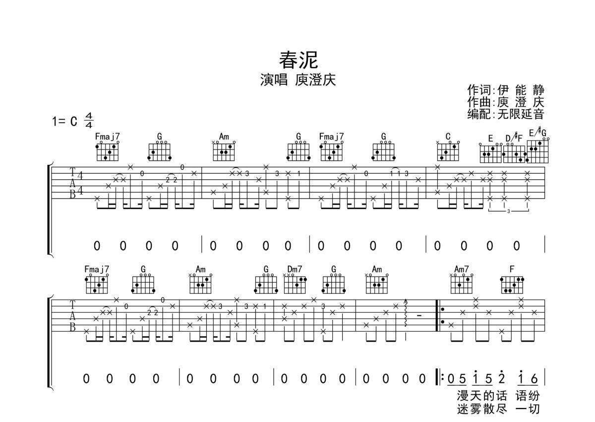 庾澄庆《春泥》吉他谱 - C调弹唱六线谱
