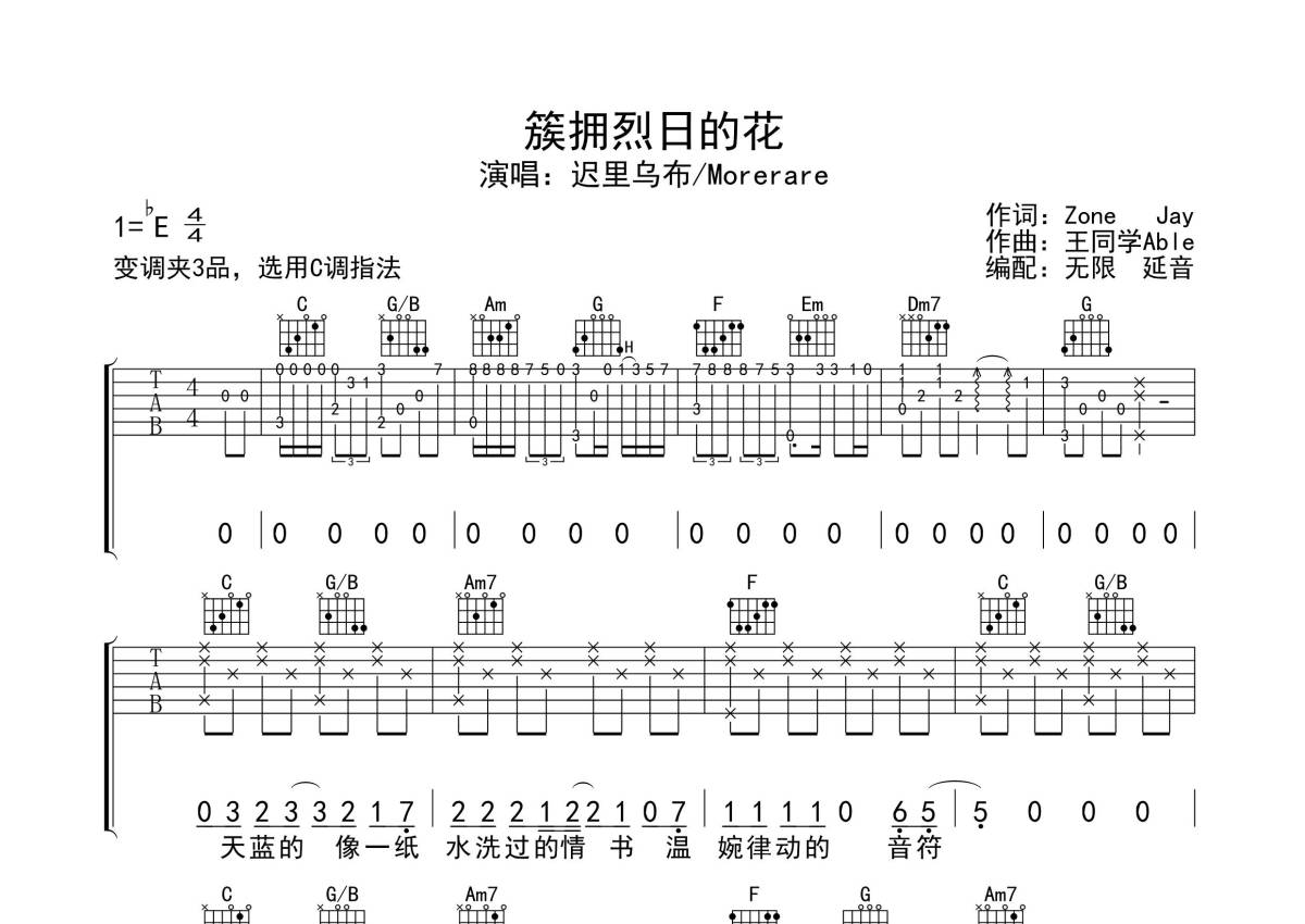 Morerare/迟里乌布《簇拥烈日的花》吉他谱 - C调弹唱六线谱