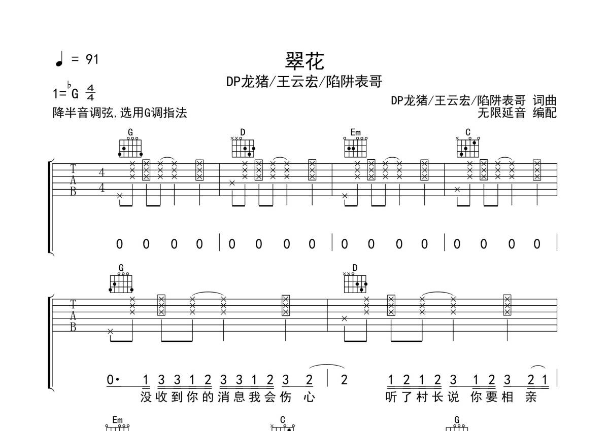DP龙猪/王云宏/陷阱表哥《翠花》吉他谱 - G调弹唱六线谱