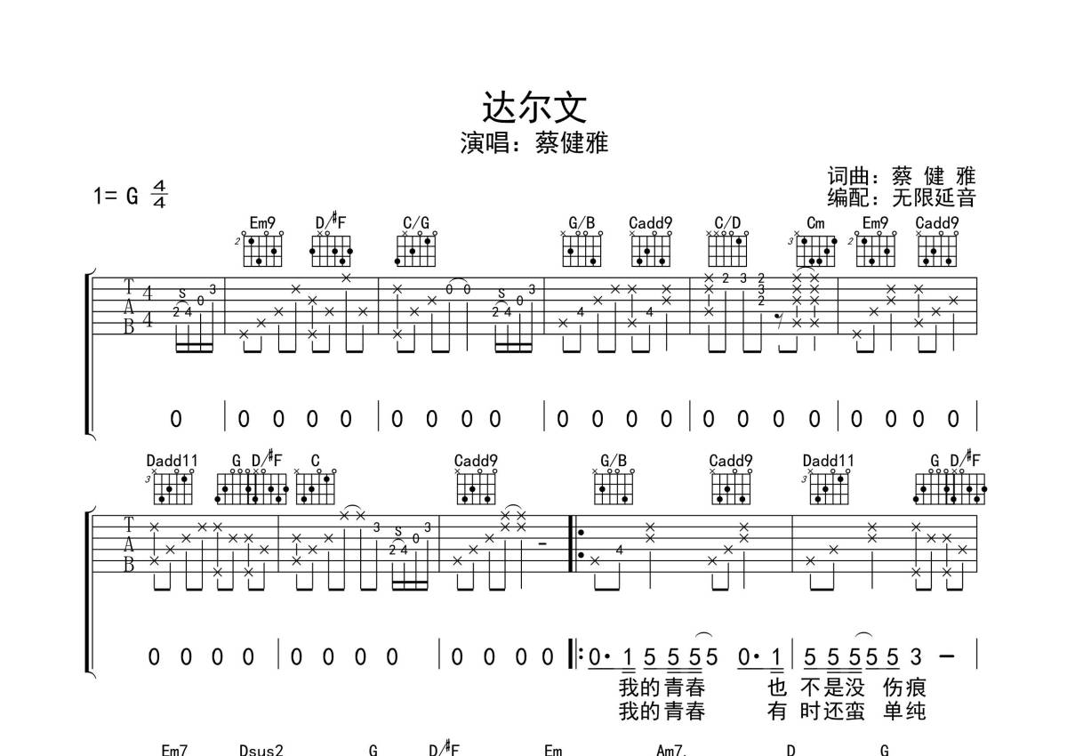 蔡健雅《达尔文》吉他谱 - G调弹唱六线谱