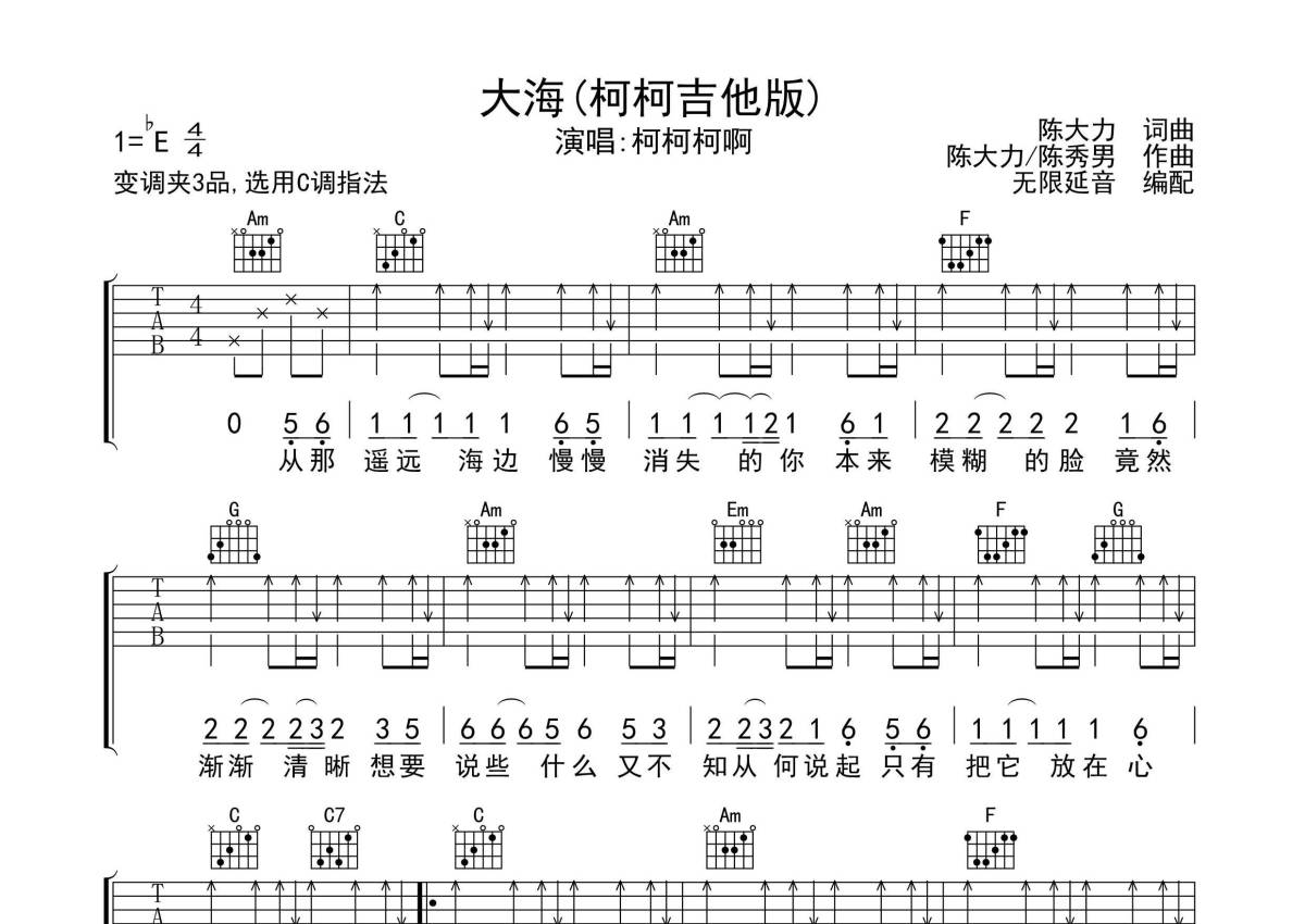 柯柯柯啊《大海》吉他谱 - C调弹唱六线谱