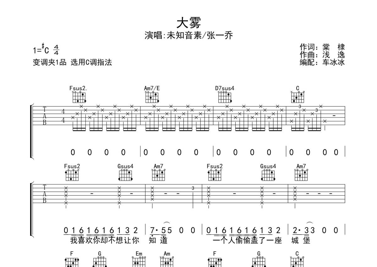 张一乔/未知因素《大雾》吉他谱 - C调弹唱六线谱
