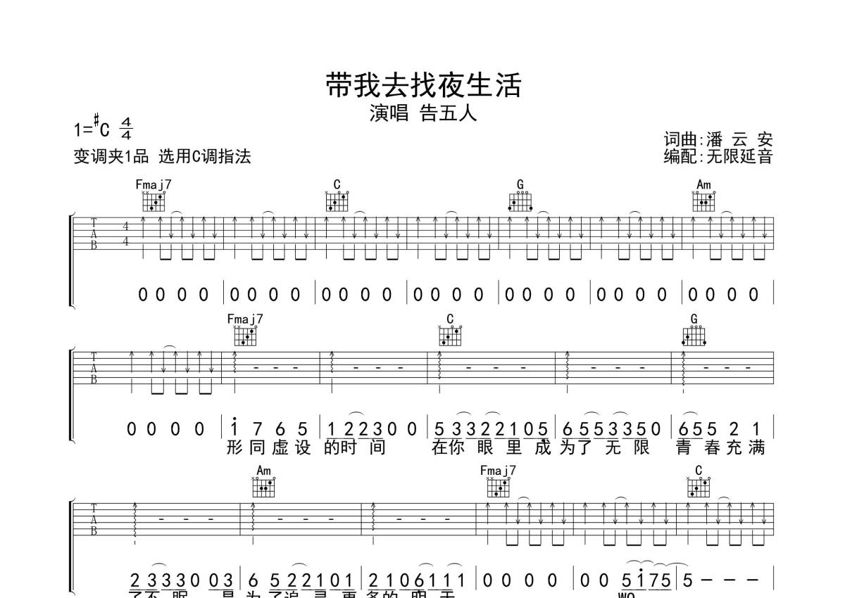 告五人《带我去找夜生活》吉他谱 - C调弹唱六线谱