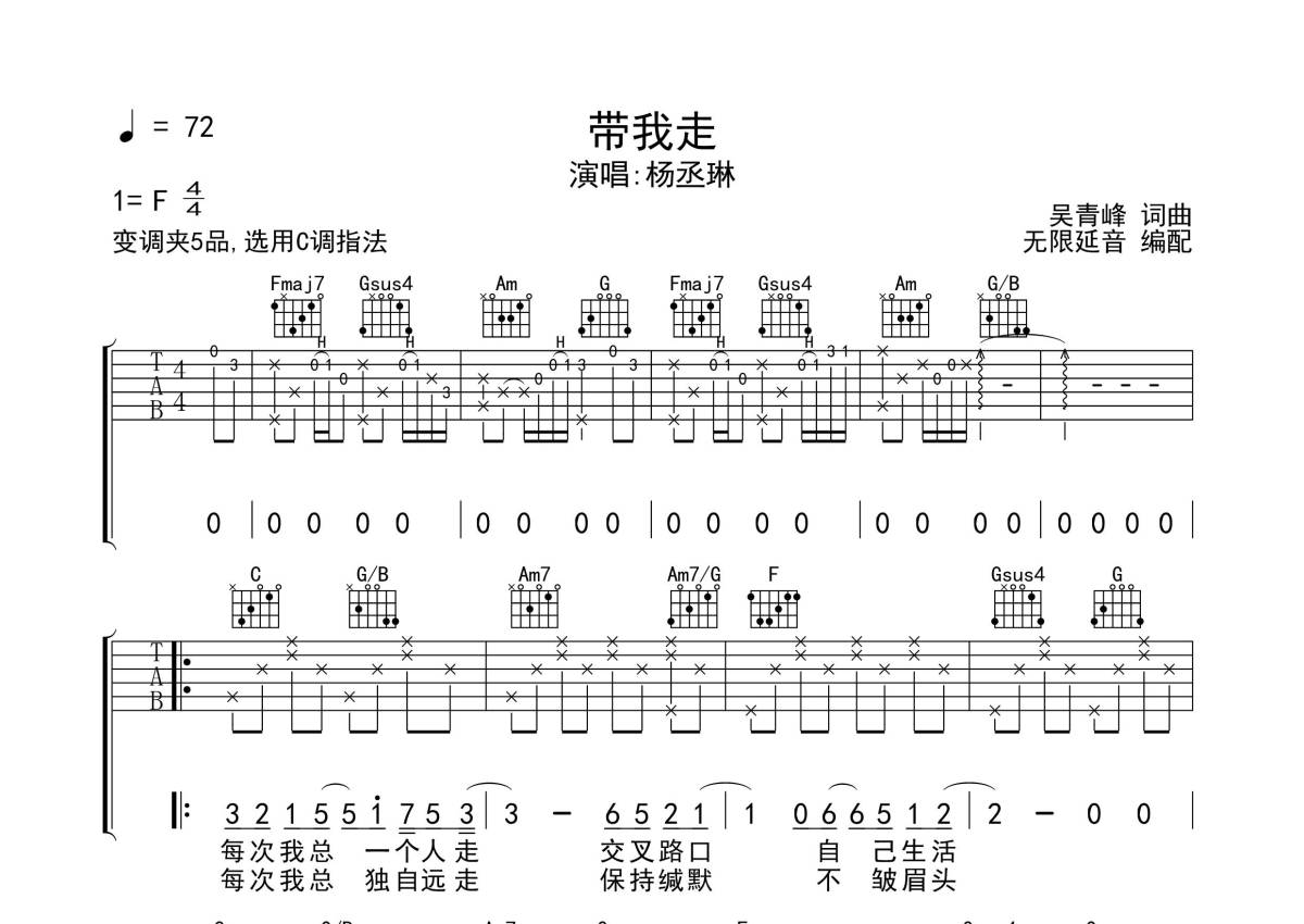 《带我走》是杨丞琳演唱的一首歌曲,歌曲原调为F调,但由于原调指法比较难,为了方便弹奏,本吉他谱采用的是C调指法编配,变调夹5品弹奏即为原调,当然也可以根据自己的音域改变变调夹位置,或者通过改变和弦调性,以方便自己弹奏,这份吉他谱共有三张高清图谱,图谱由 @无限延音 编配上传,图谱使用六线谱编配,包含吉他和弦指法、简谱以及歌词部分,使用这份带我走吉他谱,可以让你更加方便地掌握这首歌曲的弹唱技巧,快来尝试吧。