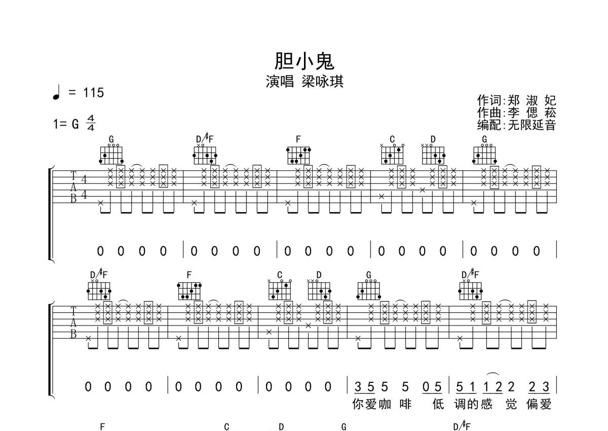 《胆小鬼》是梁咏琪演唱的一首歌曲,歌曲原调为G调,本吉他谱采用的是G调指法编配,演奏时不需要使用变调夹即为原调,这份吉他谱共有三张高清图谱,图谱由 @无限延音 编配上传,图谱使用六线谱编配,包含吉他和弦指法、简谱以及歌词部分,使用这份胆小鬼吉他谱,可以让你更加方便地掌握这首歌曲的弹唱技巧,快来尝试吧。