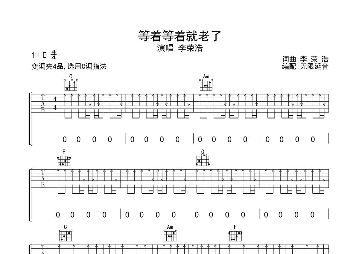 李荣浩《等着等着就老了》吉他谱 - C调弹唱六线谱