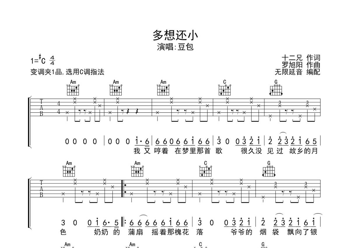 《多想还小》是豆包演唱的一首歌曲,歌曲原调为Db调,但由于原调指法比较难,为了方便弹奏,本吉他谱采用的是C调指法编配,变调夹1品弹奏即为原调,当然也可以根据自己的音域改变变调夹位置,或者通过改变和弦调性,以方便自己弹奏,这份吉他谱共有两张高清图谱,图谱由 @无限延音 编配上传,图谱使用六线谱编配,包含吉他和弦指法、简谱以及歌词部分,使用这份多想还小吉他谱,可以让你更加方便地掌握这首歌曲的弹唱技巧,快来尝试吧。