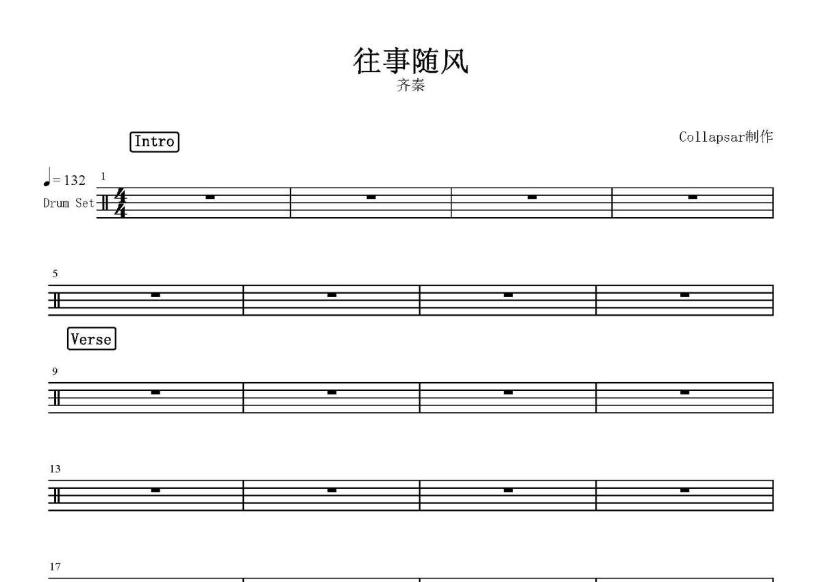 《往事随风》是齐秦演唱的一首歌曲,这份鼓谱共有四张高清图谱,图谱由 @打鼓谱 编配上传,图谱使用五线谱编配,使用这份往事随风架子鼓谱,你将能够轻松地敲打出这首齐秦的往事随风,快来尝试吧。《往事随风》是中国台湾歌手齐秦演唱的一首歌曲(经典代表作之一),由许常德填词,涂惠源谱曲,涂惠源、徐德昌编曲,收录于1995年9月1日发行的专辑《痛并快乐着》中。