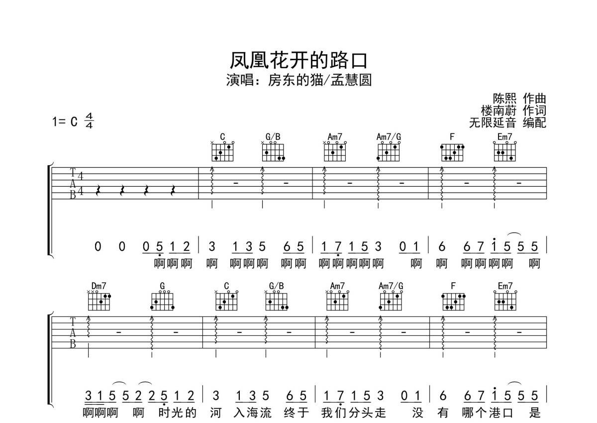 房东的猫/孟慧园《凤凰花开的路口》吉他谱 - C调弹唱六线谱