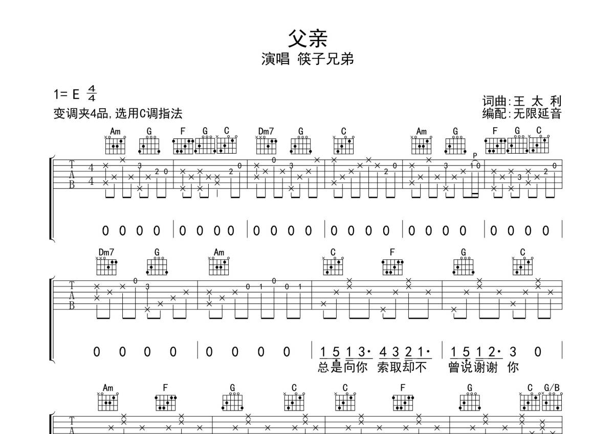 《父亲》是筷子兄弟演唱的一首歌曲,歌曲原调为E调,但由于原调指法比较难,为了方便弹奏,本吉他谱采用的是C调指法编配,变调夹4品弹奏即为原调,当然也可以根据自己的音域改变变调夹位置,或者通过改变和弦调性,以方便自己弹奏,这份吉他谱共有三张高清图谱,图谱由 @无限延音 编配上传,图谱使用六线谱编配,包含吉他和弦指法、简谱以及歌词部分,使用这份父亲吉他谱,可以让你更加方便地掌握这首歌曲的弹唱技巧,快来尝试吧。