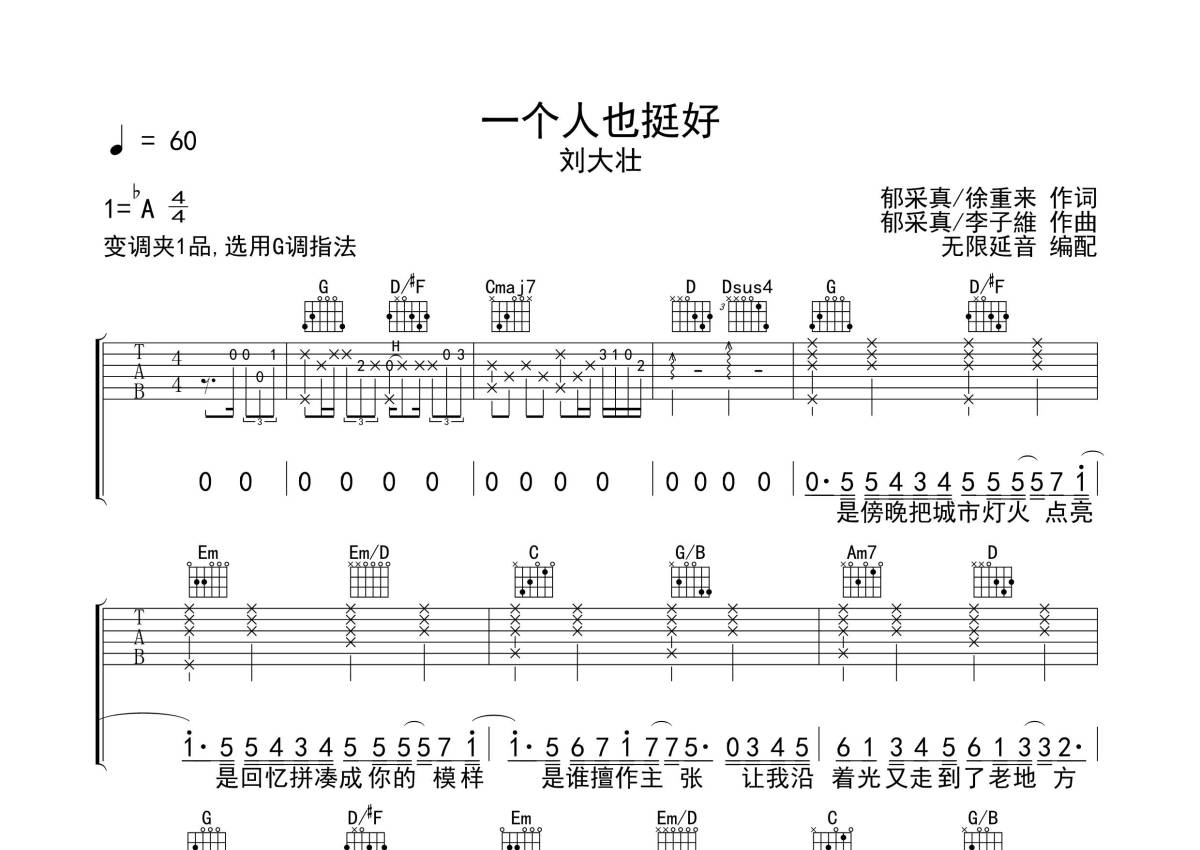 刘大壮《一个人也挺好》吉他谱 - G调弹唱六线谱