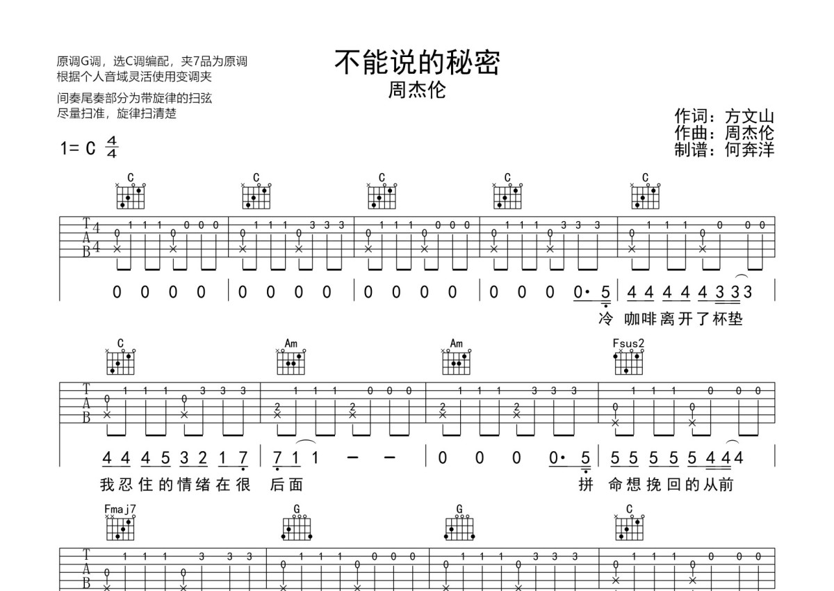 周杰伦《不能说的秘密》吉他谱 - C调弹唱六线谱 - 降调完整版