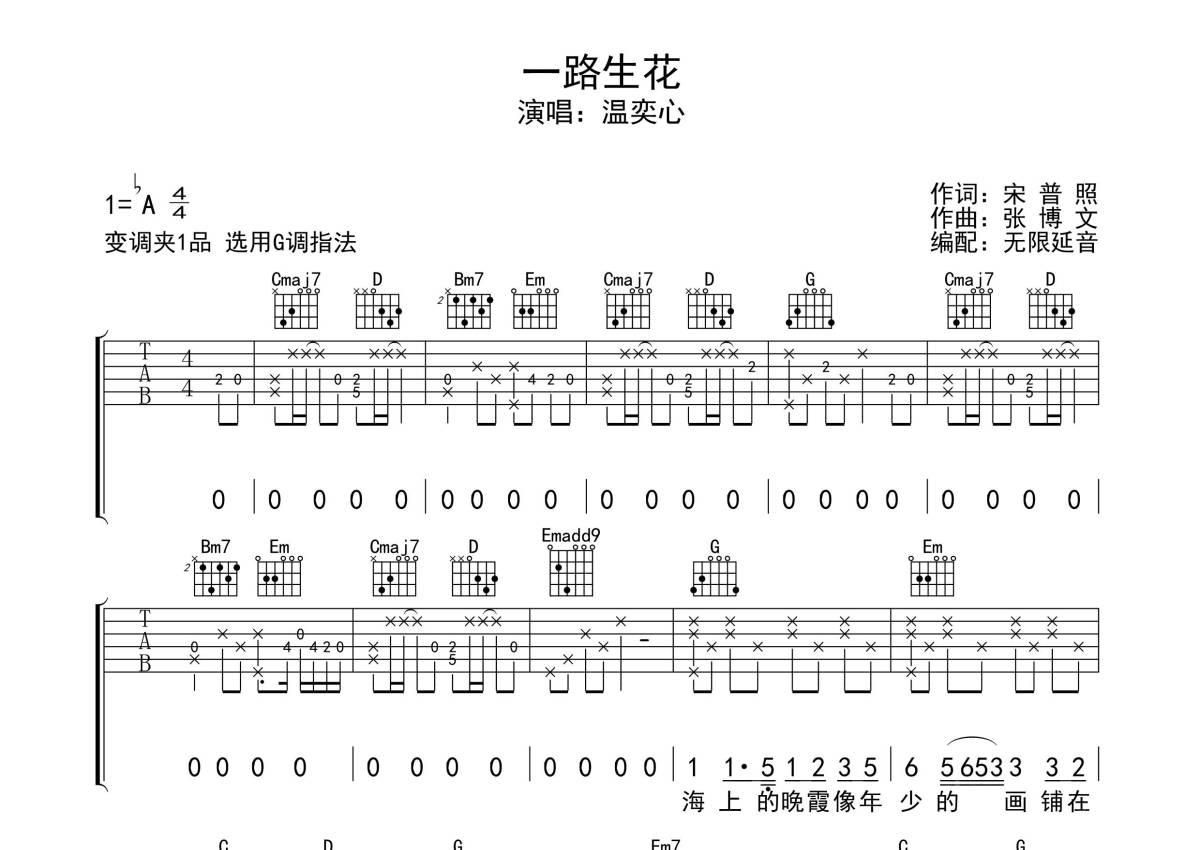 《一路生花》是温奕心演唱的一首歌曲,拍号为4/4拍,歌曲原调为Ab调,但由于原调指法比较难,为了方便弹奏,本吉他谱采用的是G调指法编配,变调夹1品弹奏即为原调,当然也可以根据自己的音域改变变调夹位置,或者通过改变和弦调性,以方便自己弹奏,这份吉他谱共有三张高清图谱,图谱由 @无限延音 编配上传,图谱使用六线谱编配,包含吉他和弦指法、简谱以及歌词部分,使用这份一路生花吉他谱,可以让你更加方便地掌握这首歌曲的弹唱技巧,快来尝试吧。