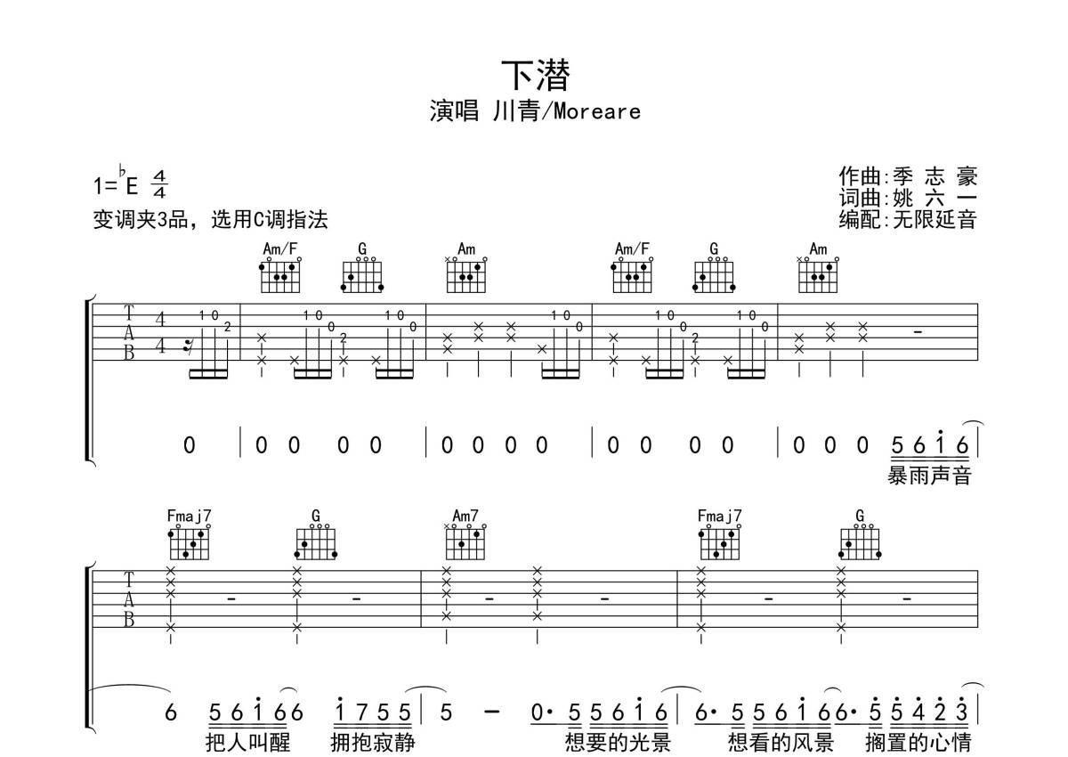川青/Moreare《下潜》吉他谱 - C调弹唱六线谱