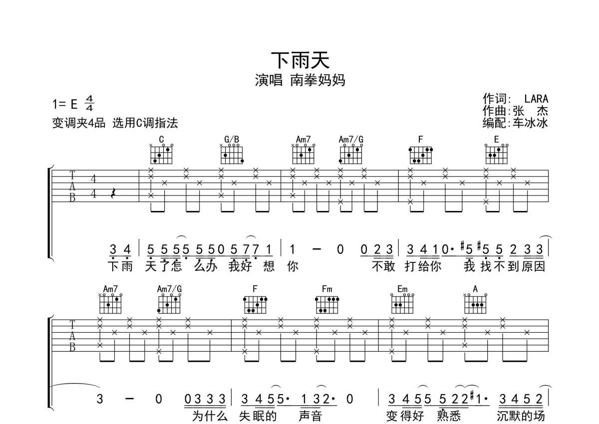 《下雨天》是南拳妈妈演唱的一首歌曲,拍号为4/4拍,歌曲原调为E调,但由于原调指法比较难,为了方便弹奏,本吉他谱采用的是C调指法编配,变调夹4品弹奏即为原调,当然也可以根据自己的音域改变变调夹位置,或者通过改变和弦调性,以方便自己弹奏,这份吉他谱共有三张高清图谱,图谱由 @无限延音 编配上传,图谱使用六线谱编配,包含吉他和弦指法、简谱以及歌词部分,使用这份下雨天吉他谱,可以让你更加方便地掌握这首歌曲的弹唱技巧,快来尝试吧。
