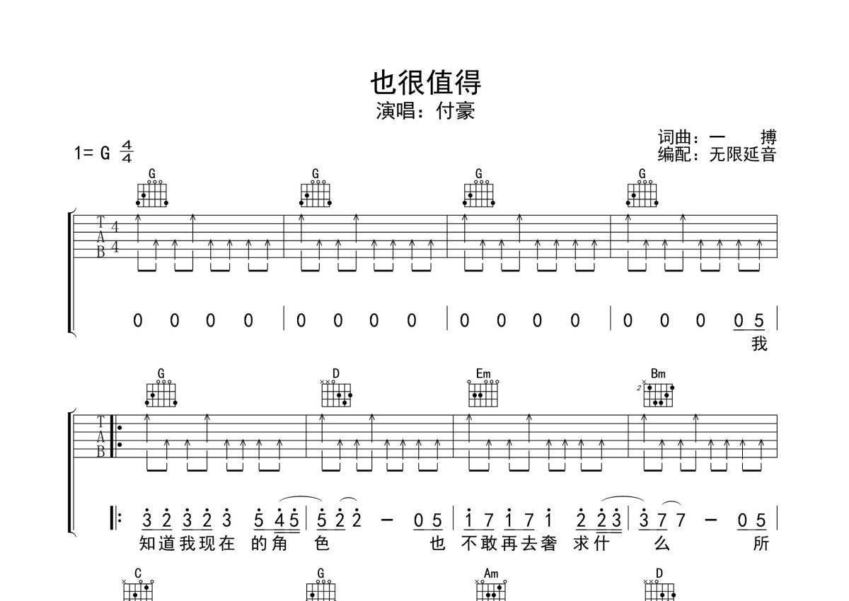 付豪《也很值得》吉他谱 - G调弹唱六线谱
