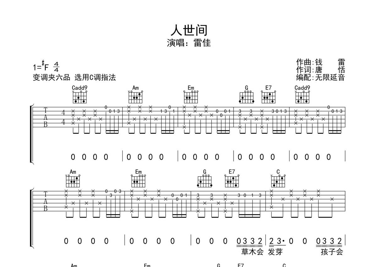 雷佳《人世间》吉他谱 - C调弹唱六线谱