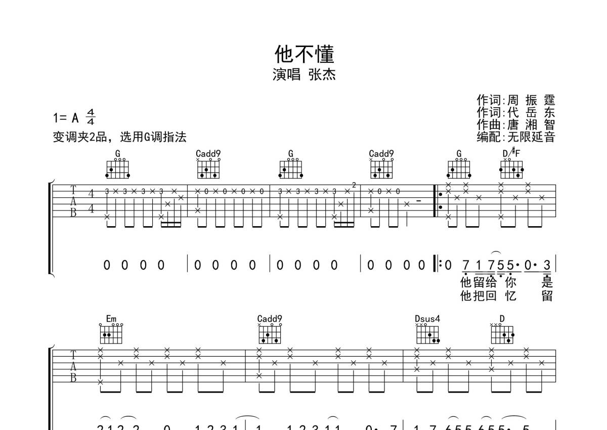 张杰《他不懂》吉他谱 - G调弹唱六线谱