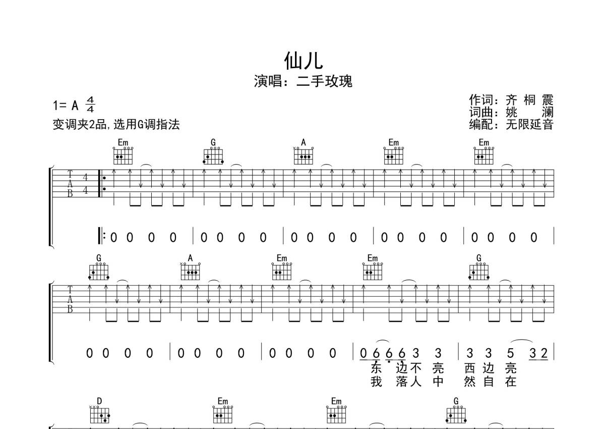 二手玫瑰《仙儿》吉他谱 - G调弹唱六线谱