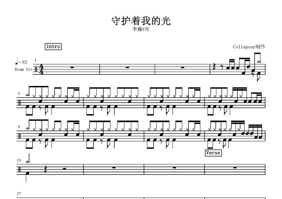 李巍V仔《守护着我的光》鼓谱 - 架子鼓谱