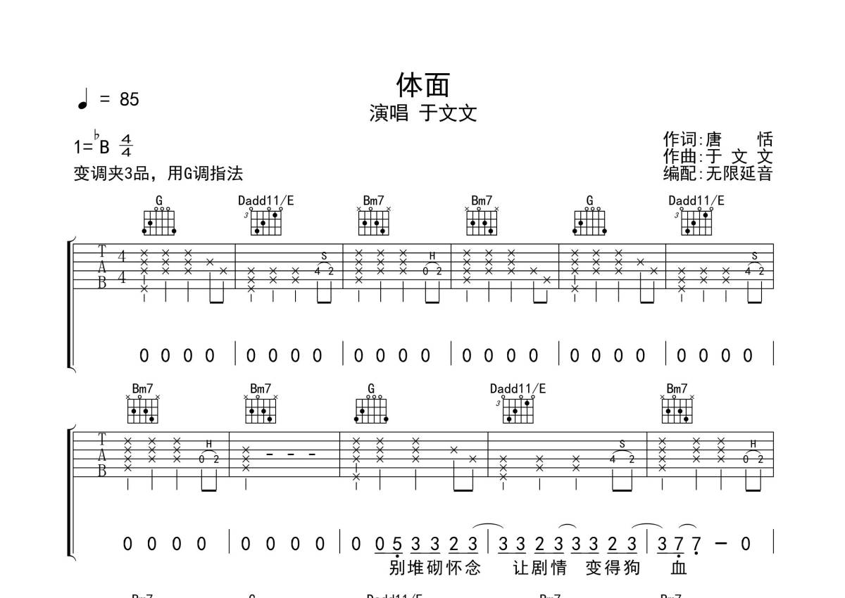 《体面》是于文文演唱的一首歌曲,拍号为4/4拍,歌曲速度为每分钟85拍,歌曲原调为Bb调,但由于原调指法比较难,为了方便弹奏,本吉他谱采用的是C调指法编配,变调夹3品弹奏即为原调,当然也可以根据自己的音域改变变调夹位置,或者通过改变和弦调性,以方便自己弹奏,这份吉他谱共有三张高清图谱,图谱由 @无限延音 编配上传,图谱使用六线谱编配,包含吉他和弦指法、简谱以及歌词部分,使用这份体面吉他谱,可以让你更加方便地掌握这首歌曲的弹唱技巧,快来尝试吧。