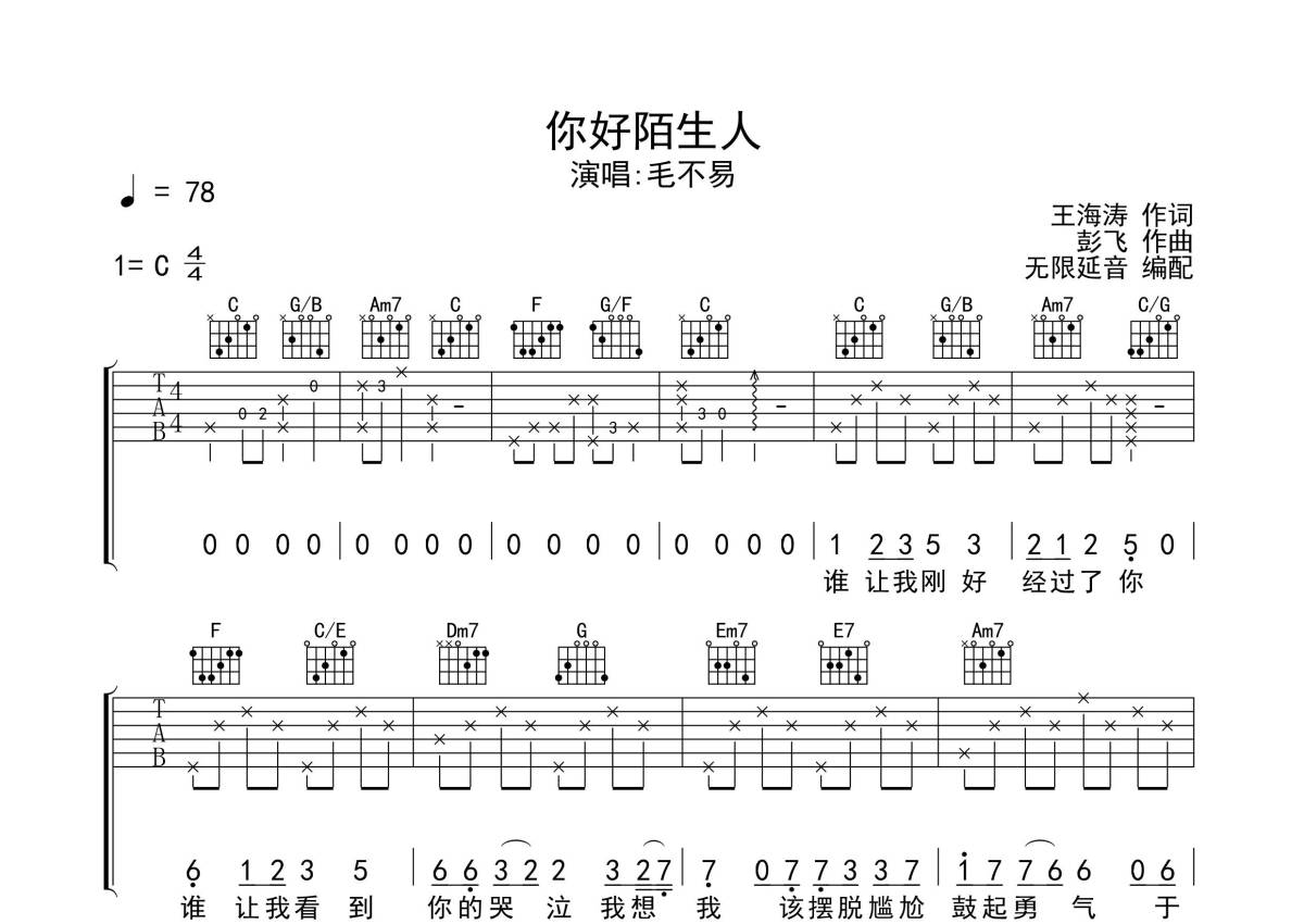 毛不易《你好陌生人》吉他谱 - C调弹唱六线谱