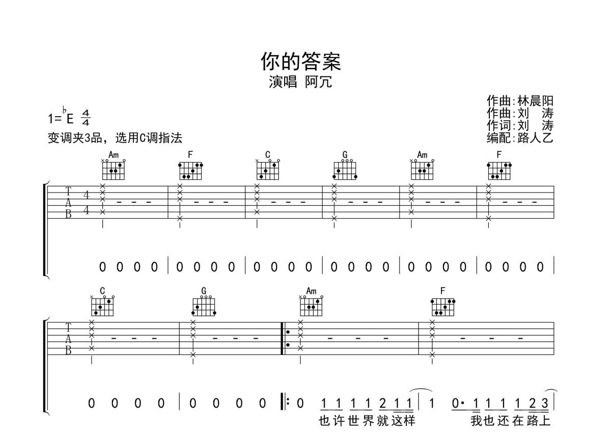 《你的答案》是阿冗演唱的一首歌曲,拍号为4/4拍,歌曲原调为Eb调,但由于原调指法比较难,为了方便弹奏,本吉他谱采用的是C调指法编配,变调夹3品弹奏即为原调,当然也可以根据自己的音域改变变调夹位置,或者通过改变和弦调性,以方便自己弹奏,这份吉他谱共有三张高清图谱,图谱由 @无限延音 编配上传,图谱使用六线谱编配,包含吉他和弦指法、简谱以及歌词部分,使用这份你的答案吉他谱,可以让你更加方便地掌握这首歌曲的弹唱技巧,快来尝试吧。