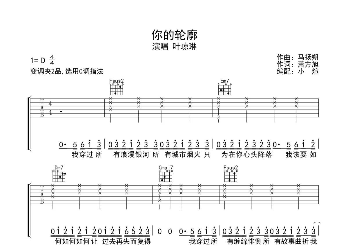《你的轮廓》是叶琼琳演唱的一首歌曲,拍号为4/4拍,歌曲原调为D调,但由于原调指法比较难,为了方便弹奏,本吉他谱采用的是C调指法编配,变调夹2品弹奏即为原调,当然也可以根据自己的音域改变变调夹位置,或者通过改变和弦调性,以方便自己弹奏,这份吉他谱共有三张高清图谱,图谱由 @无限延音 编配上传,图谱使用六线谱编配,包含吉他和弦指法、简谱以及歌词部分,使用这份你的轮廓吉他谱,可以让你更加方便地掌握这首歌曲的弹唱技巧,快来尝试吧。